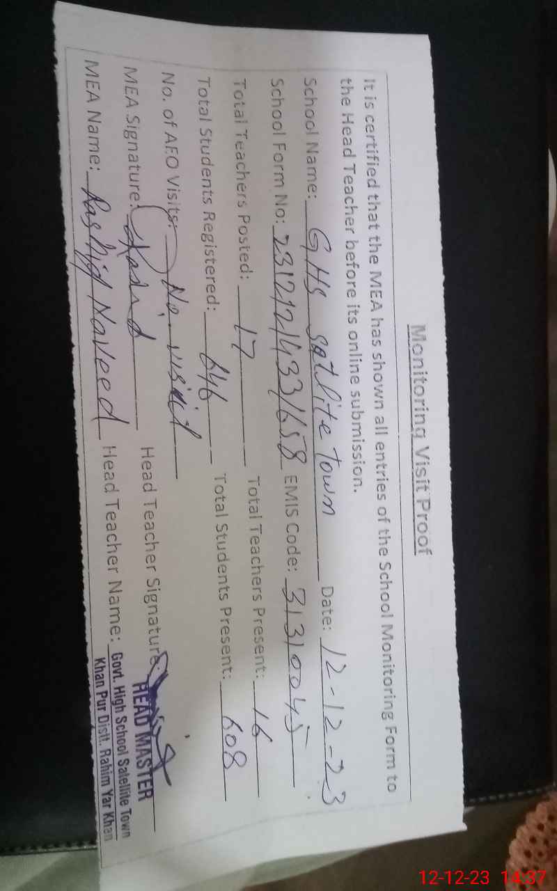 | EMIS Code: 31310045 | Name of School: GHS SATELLITE TOWN KHANPUR | |||