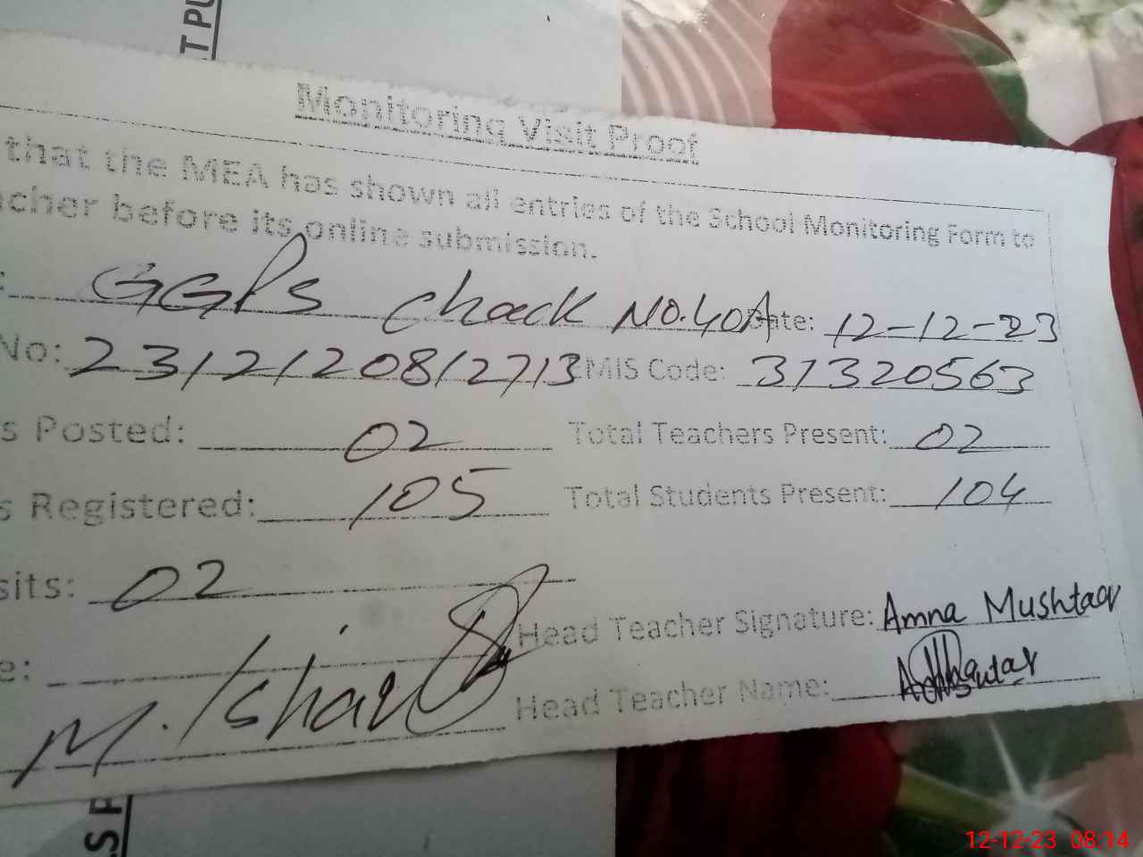 | Attendance Register | Head Teacher | MEA with School | Visit Proof |