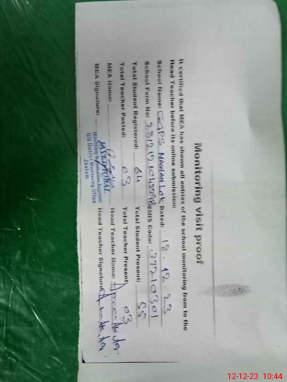 | Attendance Register | Head Teacher | MEA with School | Visit Proof |