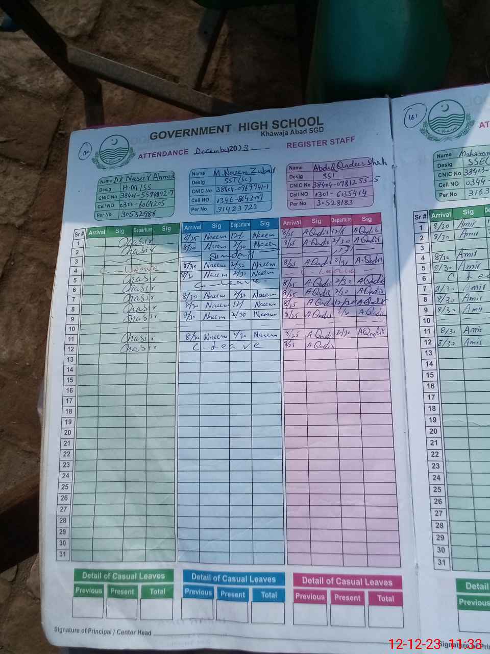 | CNIC | Full Name | Designation | R/C | Absence during last cal. month |