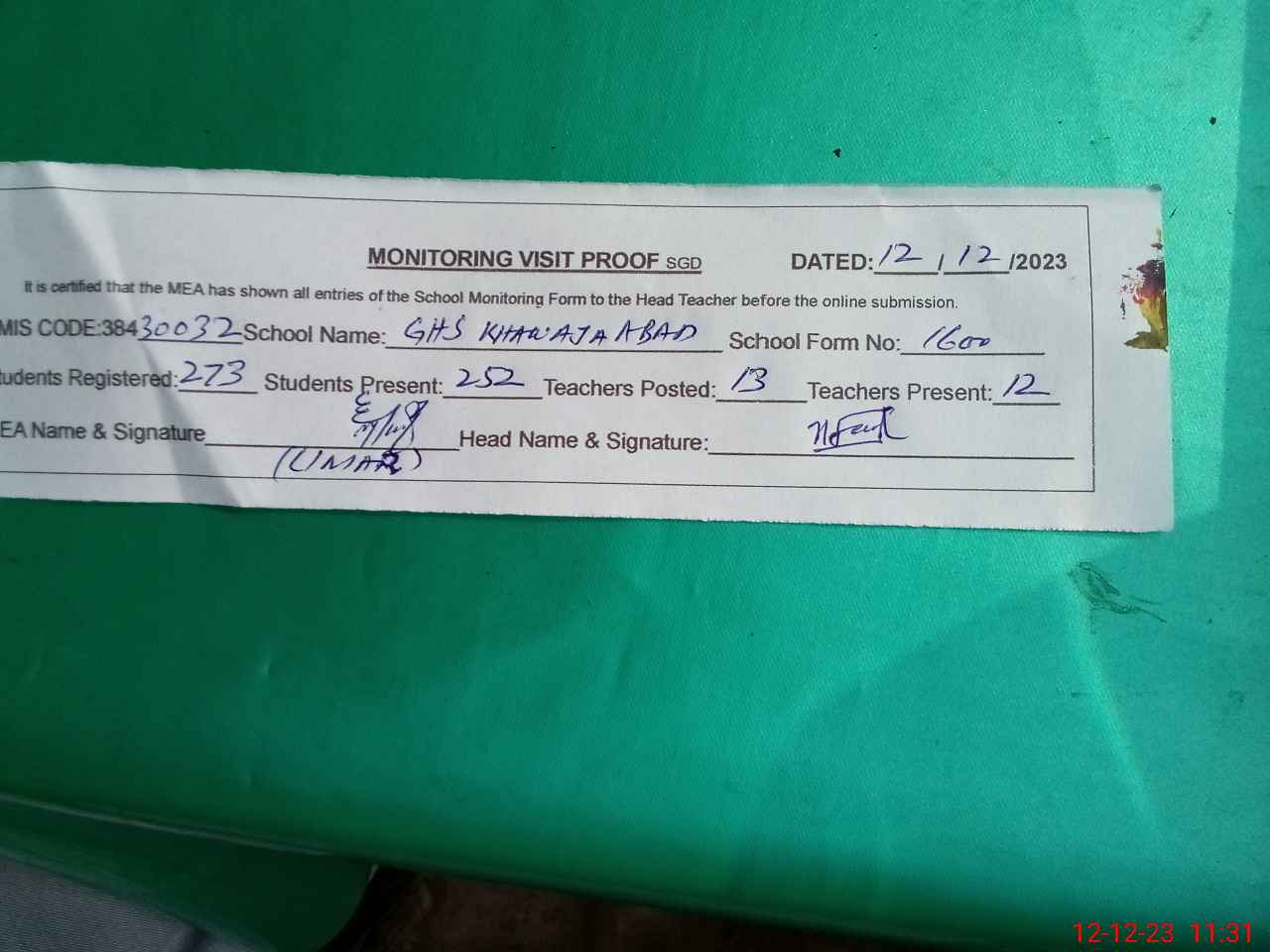 | Attendance Register | Head Teacher | MEA with School | Visit Proof |