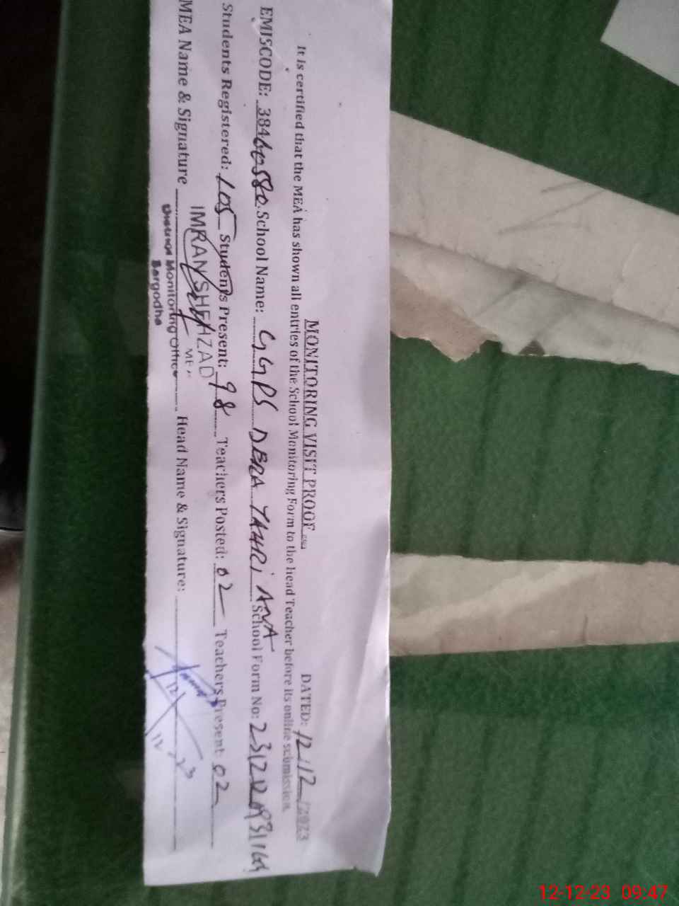 | Monitoring Date: 12-12-2023 | Start Time: 12-12-2023 09:31 AM | End Time: 12-12-2023 09:58 AM | Name of MEA: IM**** SH**** | |