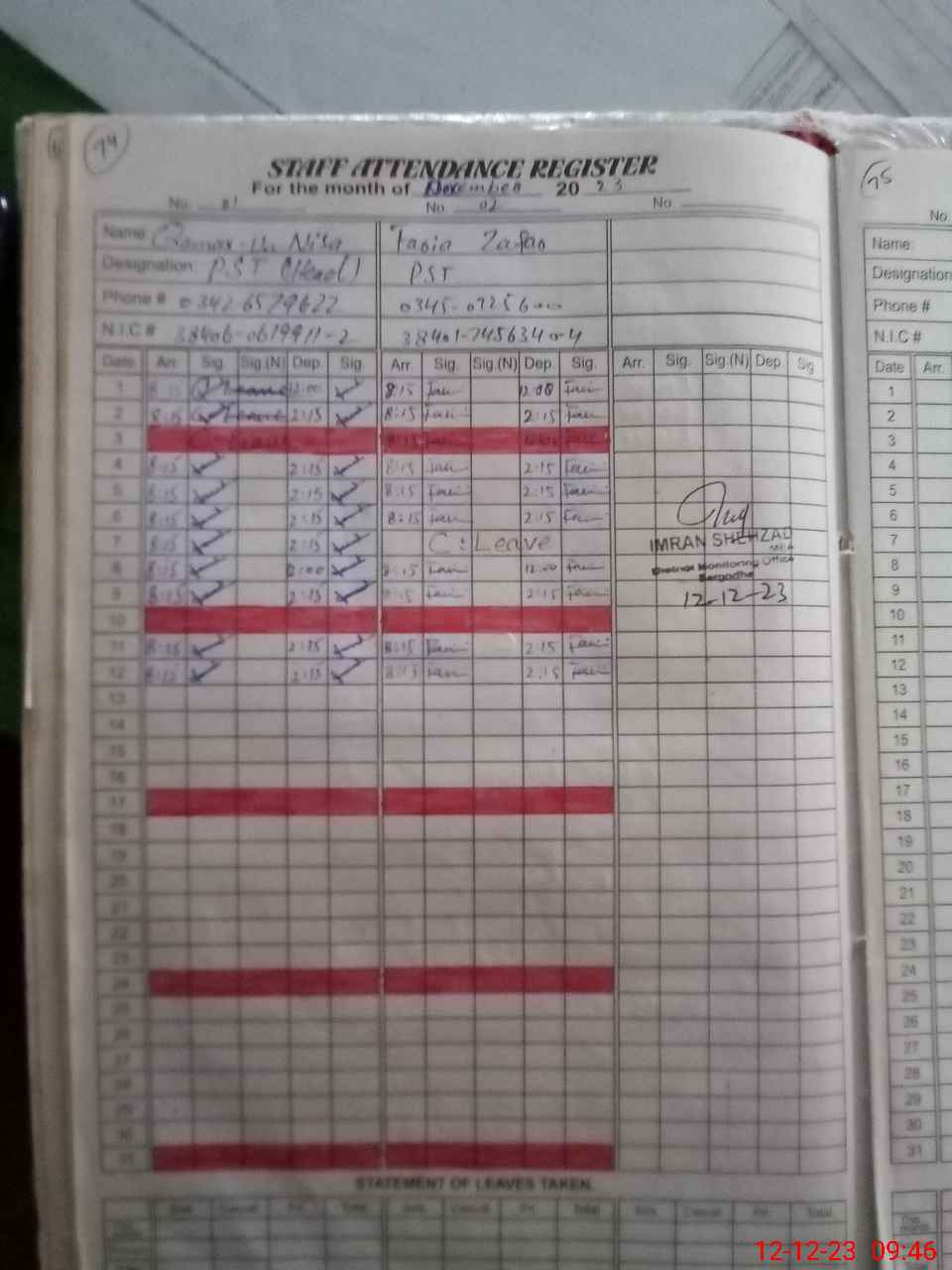 | CNIC | Full Name | Designation | R/C | Absence during last cal. month |