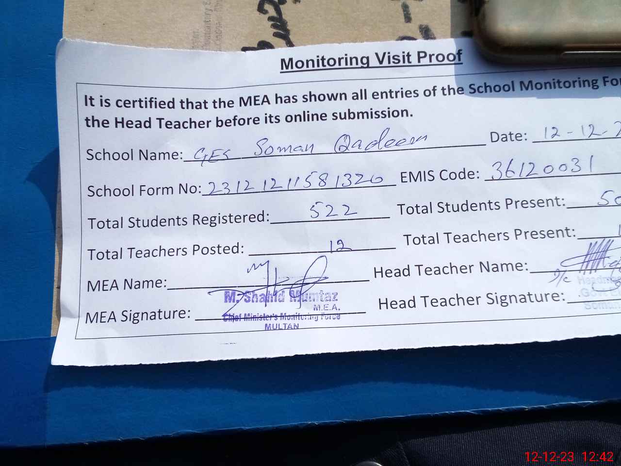 | EMIS Code: 36120031 | Name of School: GES SOMAN QADEEM P/O AGHAR KHAWANI | |||