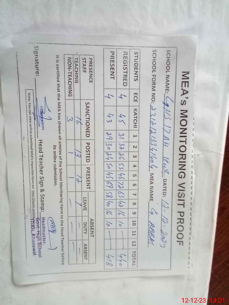 | Attendance Register | Head Teacher | MEA with School | Visit Proof |