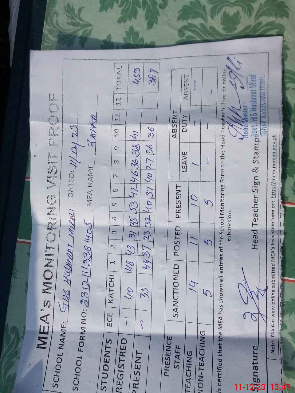 | EMIS Code: 36410057 | Name of School: GHS HASHMAT MIRALI, SARAI SIDHU | |||