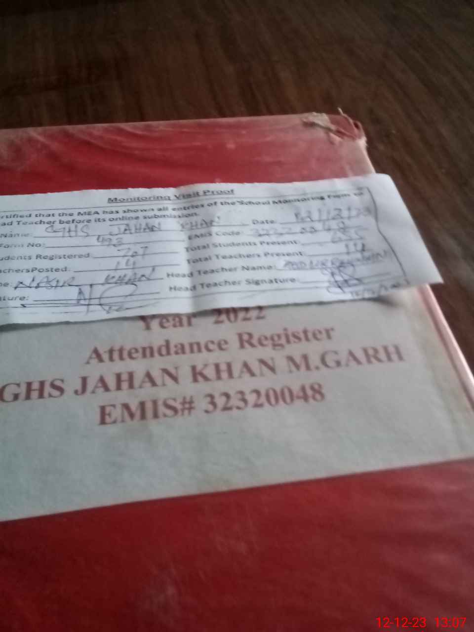| Attendance Register | Head Teacher | MEA with School | Visit Proof |