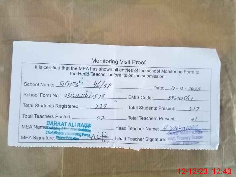 | EMIS Code: 39210561 | Name of School: GGES 46/SP | |||