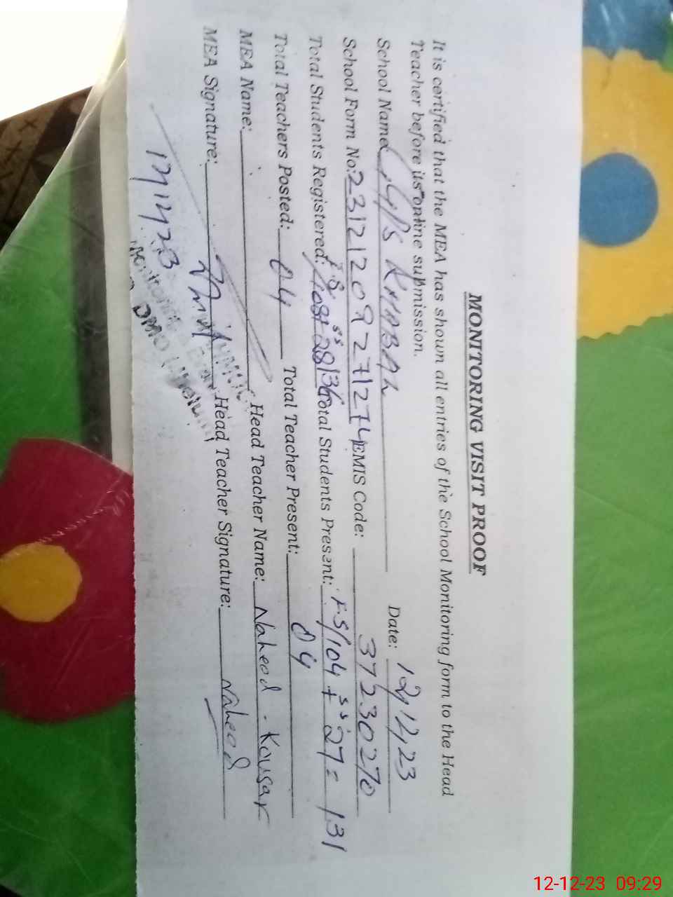| Attendance Register | Head Teacher | MEA with School | Visit Proof |