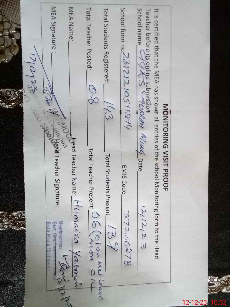 | Attendance Register | Head Teacher | MEA with School | Visit Proof |