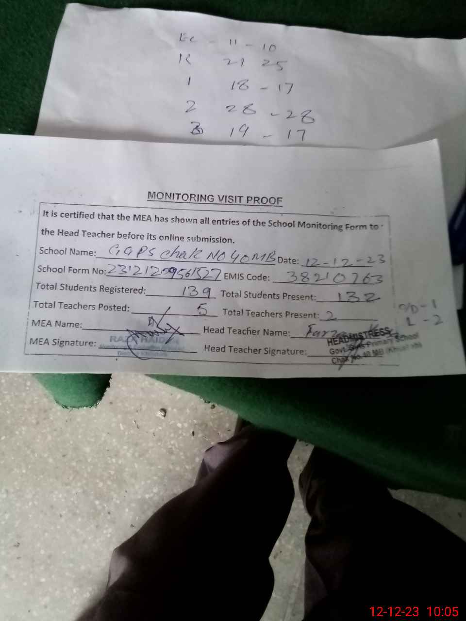 | Attendance Register | Head Teacher | MEA with School | Visit Proof |