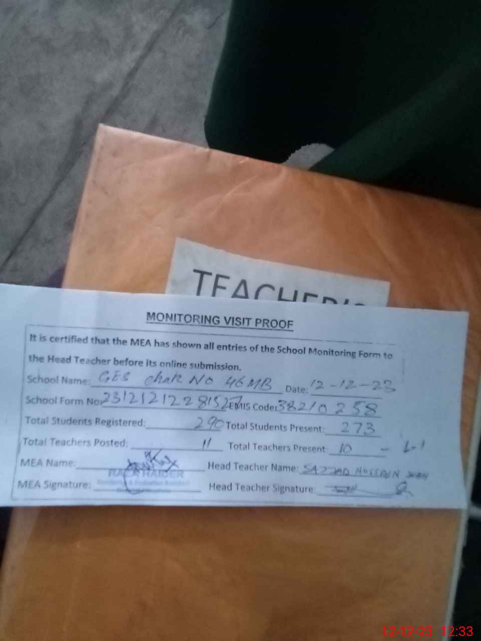 | Attendance Register | Head Teacher | MEA with School | Visit Proof |