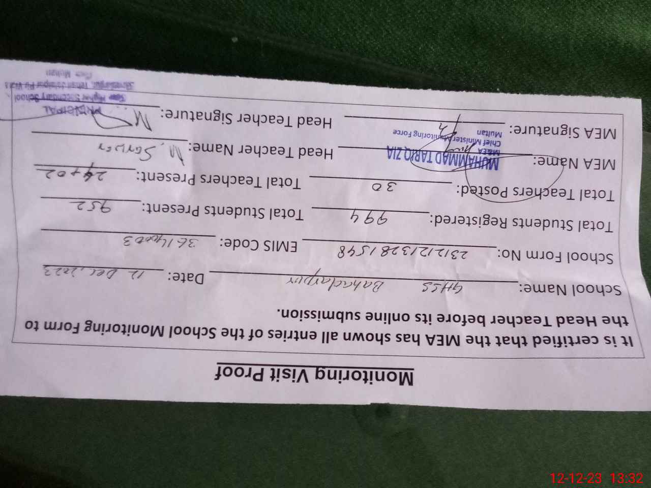 | Name: MU**** SA**** Designation: (School Headmaster's/Headmistress's) PRINCIPAL Phone/Cell Number: 03**** |