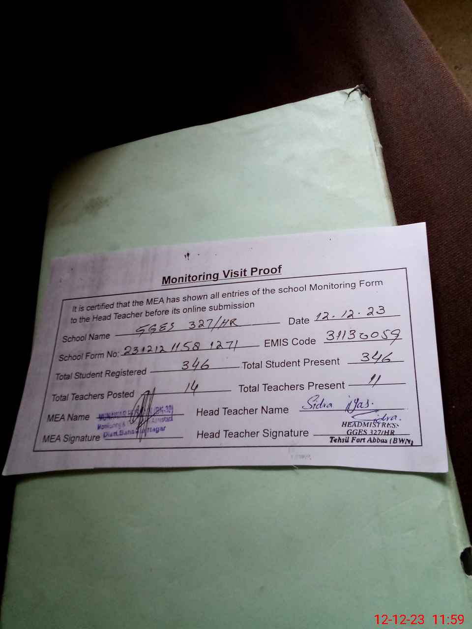 | Attendance Register | Head Teacher | MEA with School | Visit Proof |