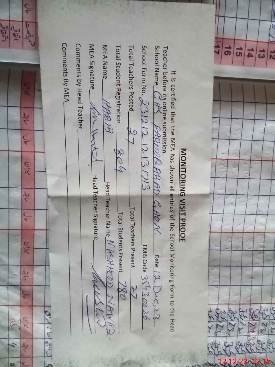 | Attendance Register | Head Teacher | MEA with School | Visit Proof |
