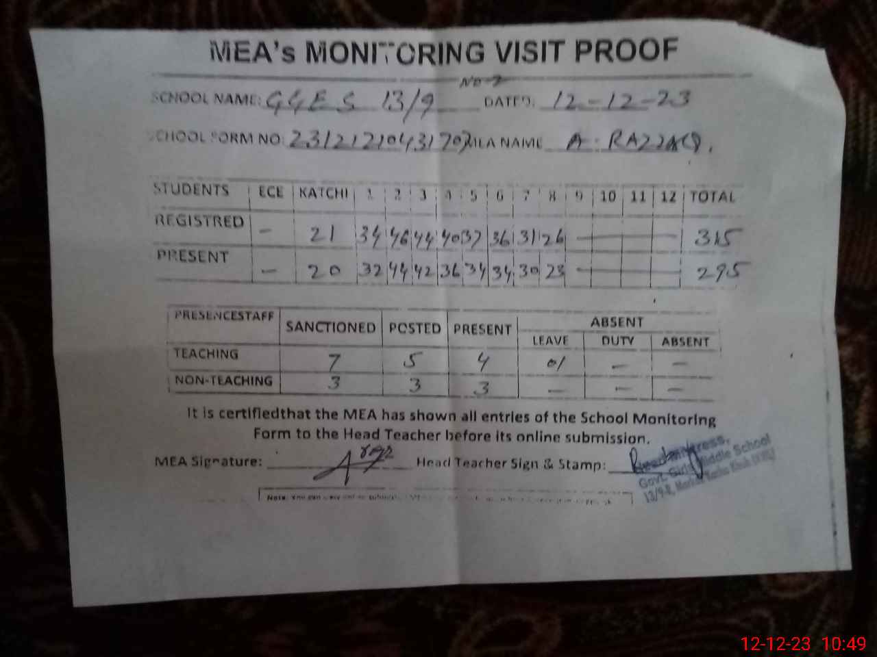 | Attendance Register | Head Teacher | MEA with School | Visit Proof |