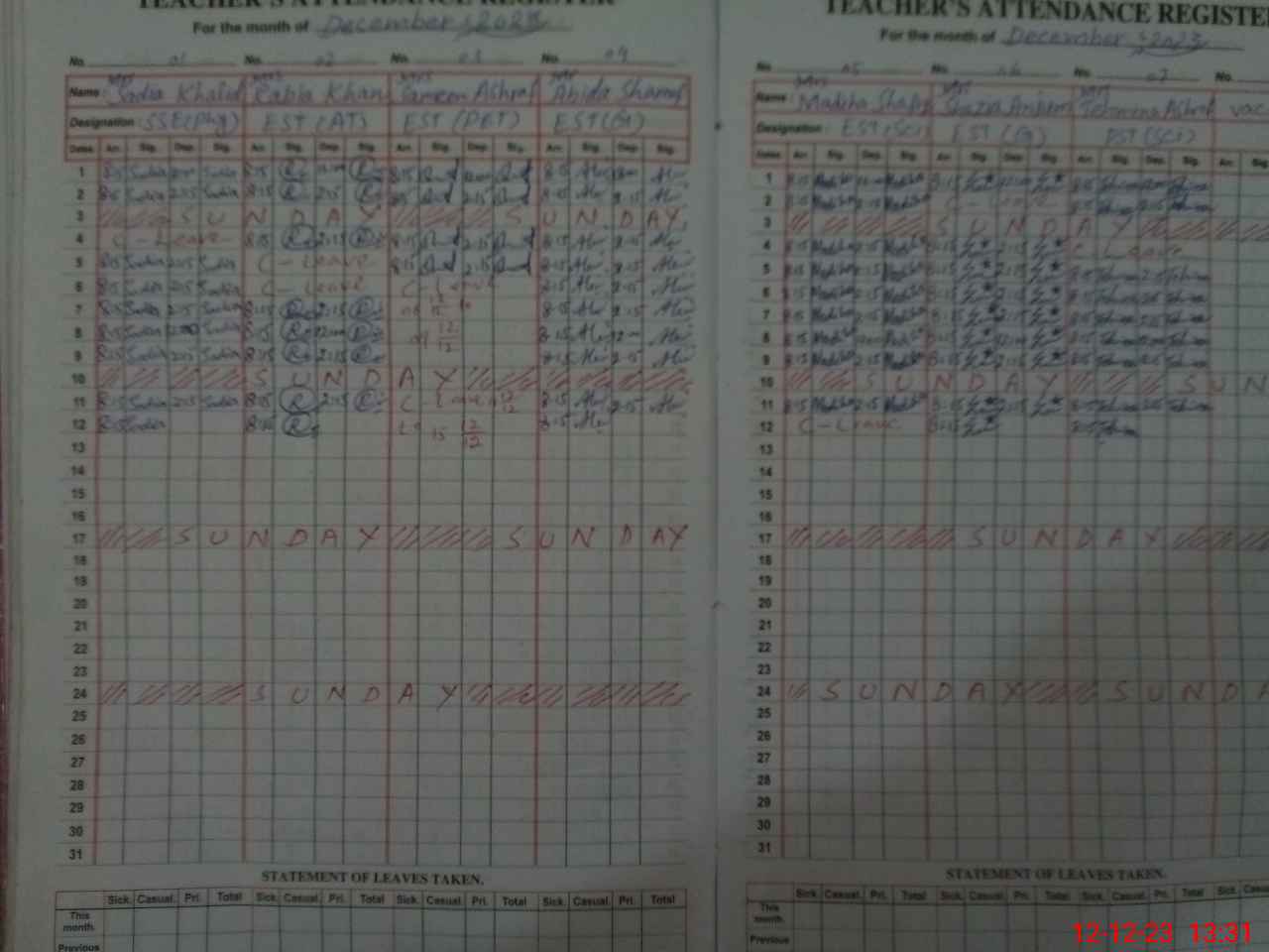 | No. of Students Present - Female | 0 | 0 | 42 | 50 | 30 | 32 | 40 | 51 | 41 | 46 | 33 | 32 | 31 | 428 | ||