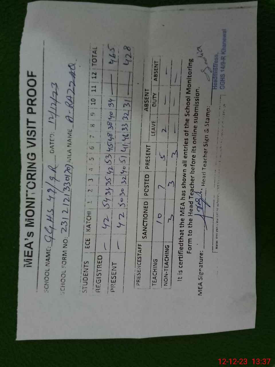 | Attendance Register | Head Teacher | MEA with School | Visit Proof |