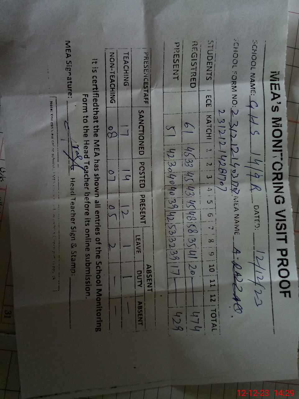 | Attendance Register | Head Teacher | MEA with School | Visit Proof |