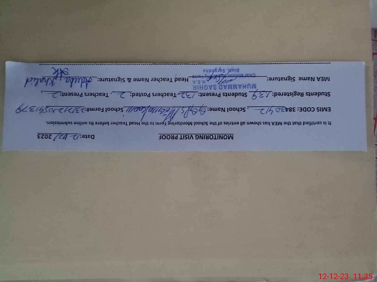 | Certified that this School was Inspected by the Undersigned MEA/DMO Today and the Information Stated Above is as Per Record. | |||||