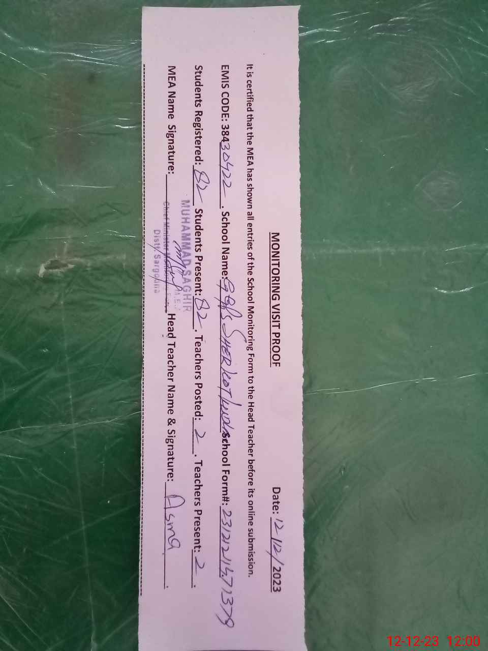 | Attendance Register | Head Teacher | MEA with School | Visit Proof |