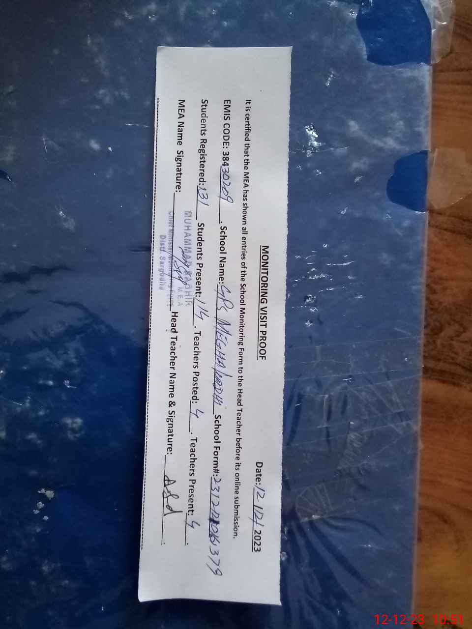 | Attendance Register | Head Teacher | MEA with School | Visit Proof |
