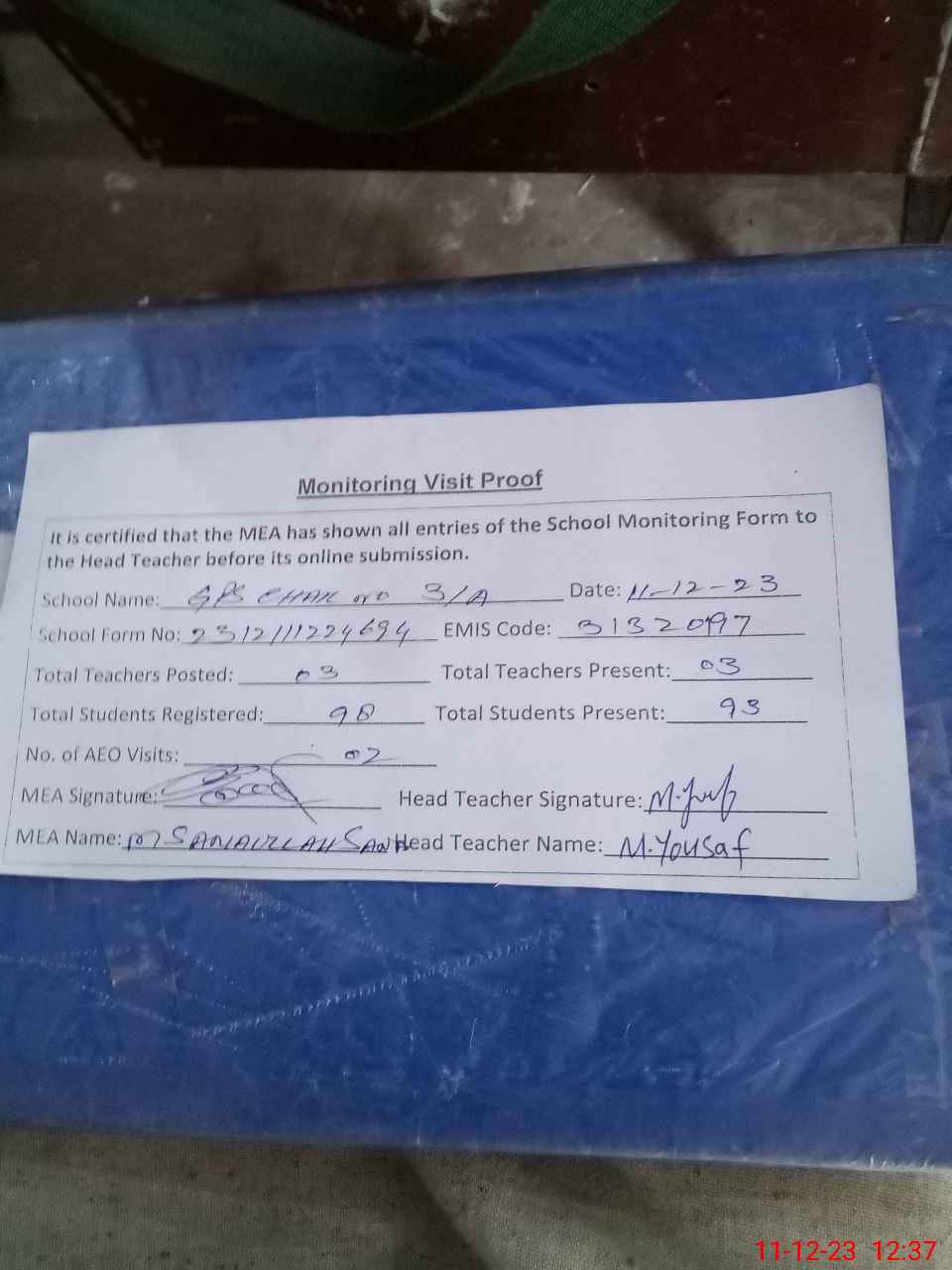 | Attendance Register | Head Teacher | MEA with School | Visit Proof |