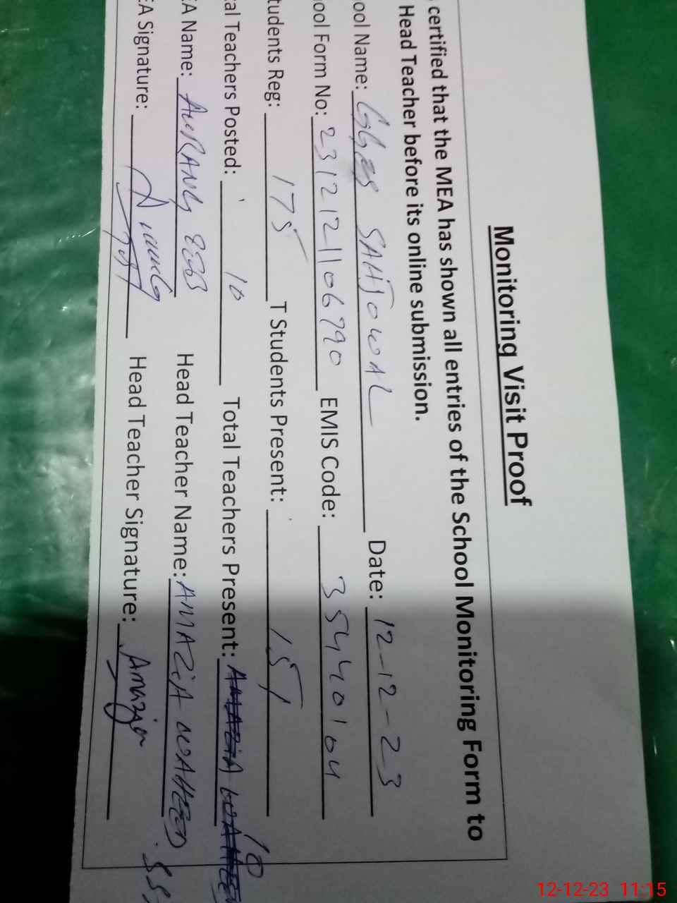 | Attendance Register | Head Teacher | MEA with School | Visit Proof |