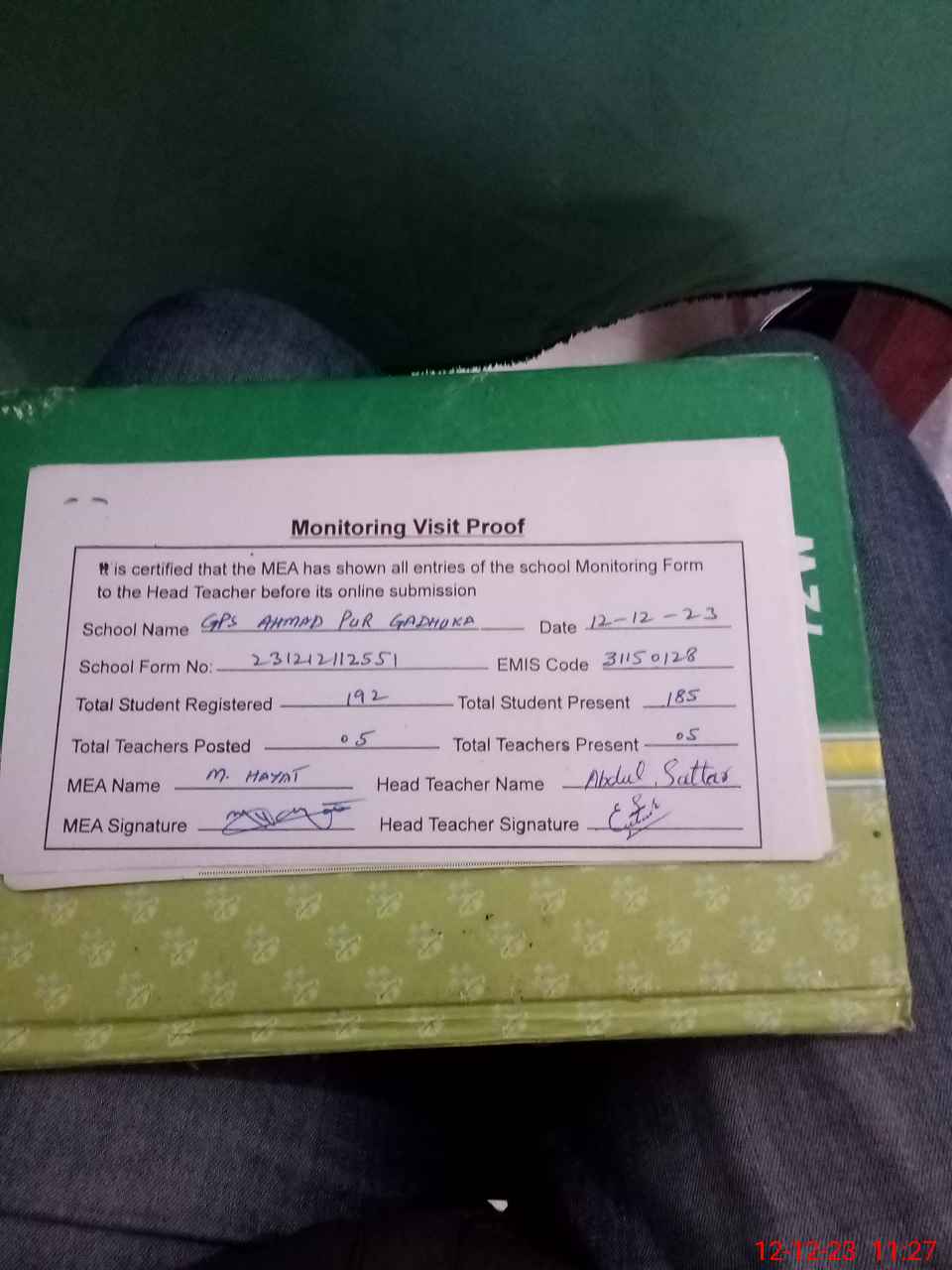 | Attendance Register | Head Teacher | MEA with School | Visit Proof |