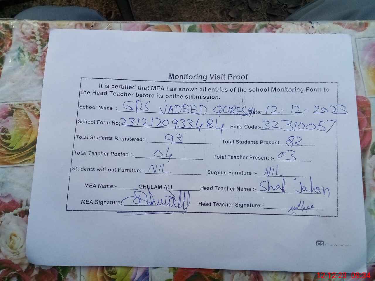 | Attendance Register | Head Teacher | MEA with School | Visit Proof |