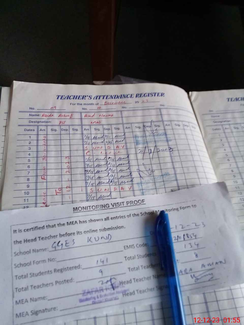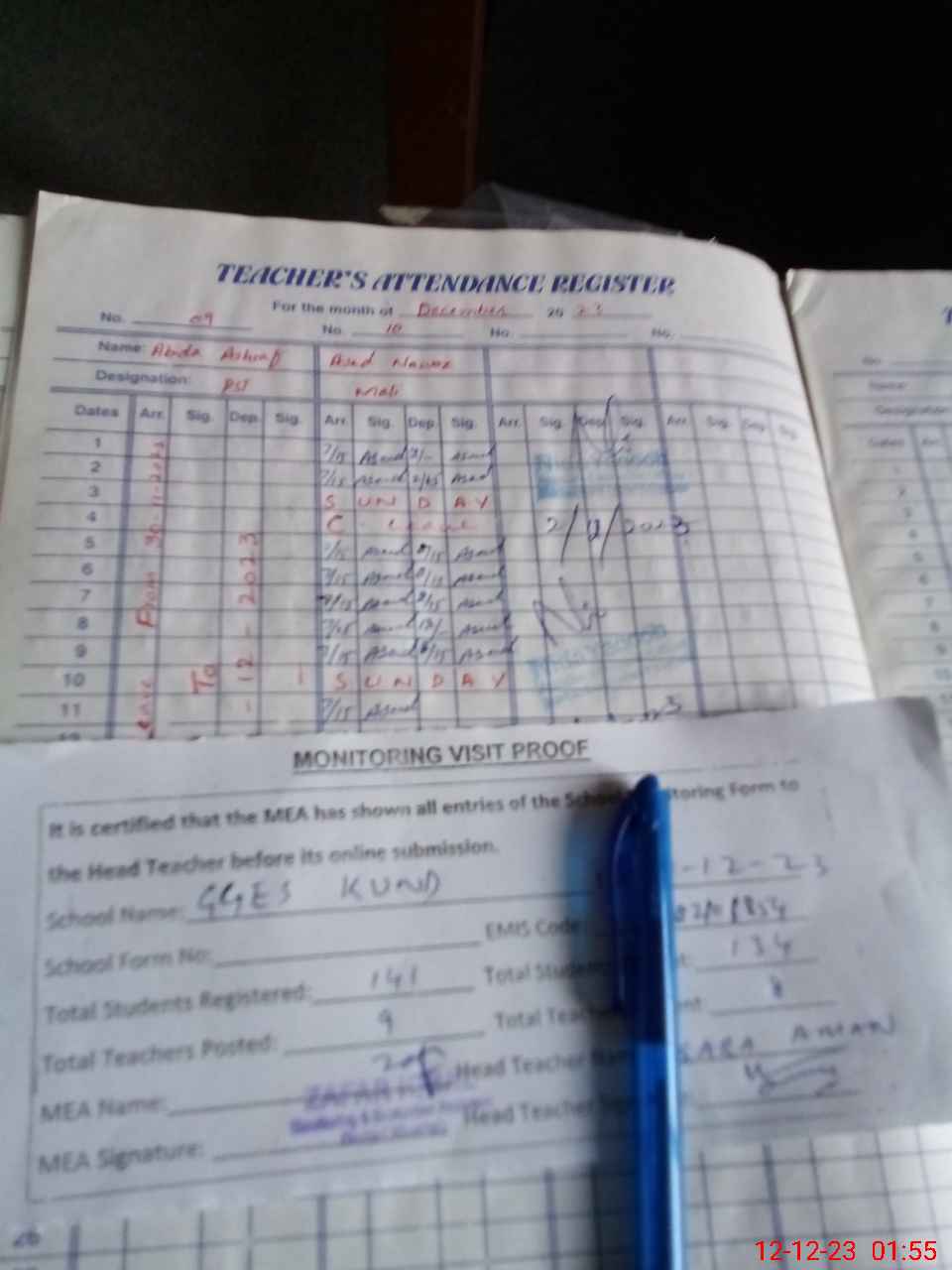 | Attendance Register | Head Teacher | MEA with School | Visit Proof |