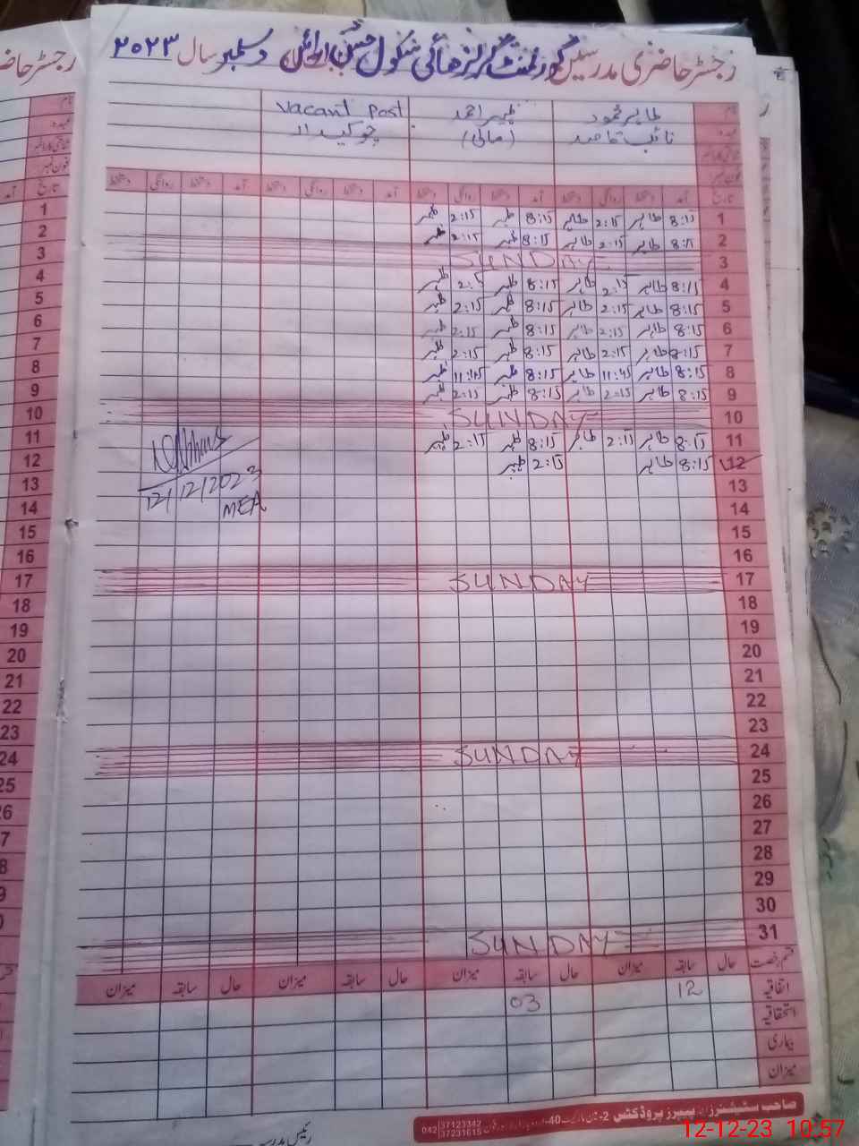 | CNIC | Full Name | Designation | R/C | Absence During Last Calender Month |