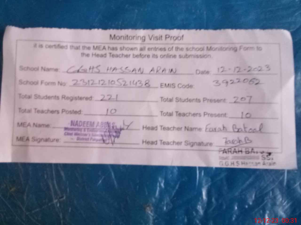 | Attendance Register | Head Teacher | MEA with School | Visit Proof |