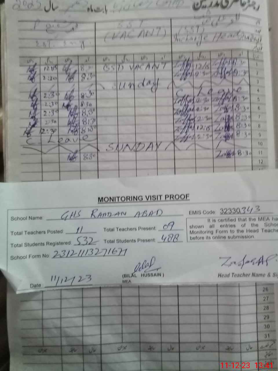| Attendance Register | Head Teacher | MEA with School | Visit Proof |