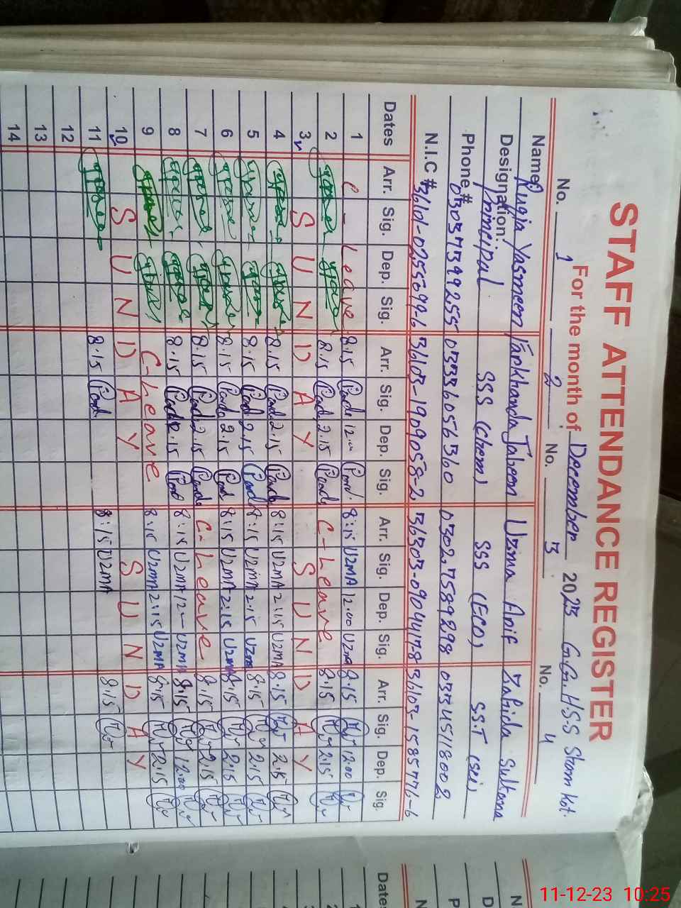 | CNIC | Full Name | Designation | R/C | Absence During Last Calender Month |