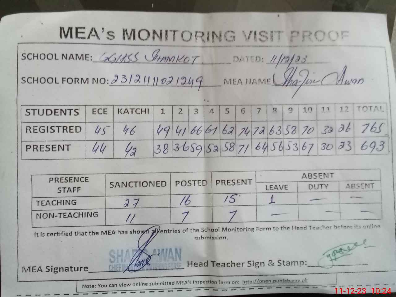 | Attendance Register | Head Teacher | MEA with School | Visit Proof |