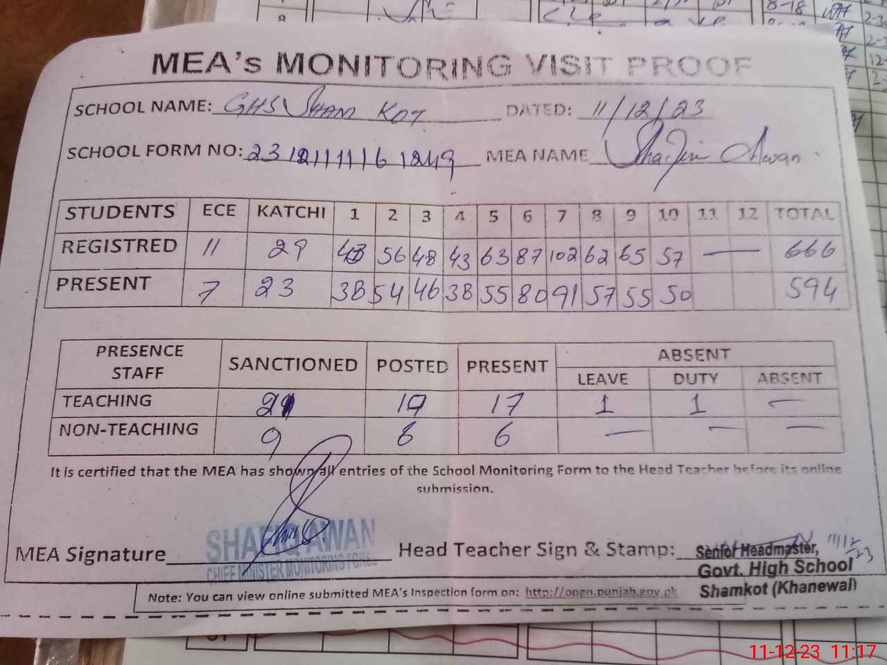 | Attendance Register | Head Teacher | MEA with School | Visit Proof |