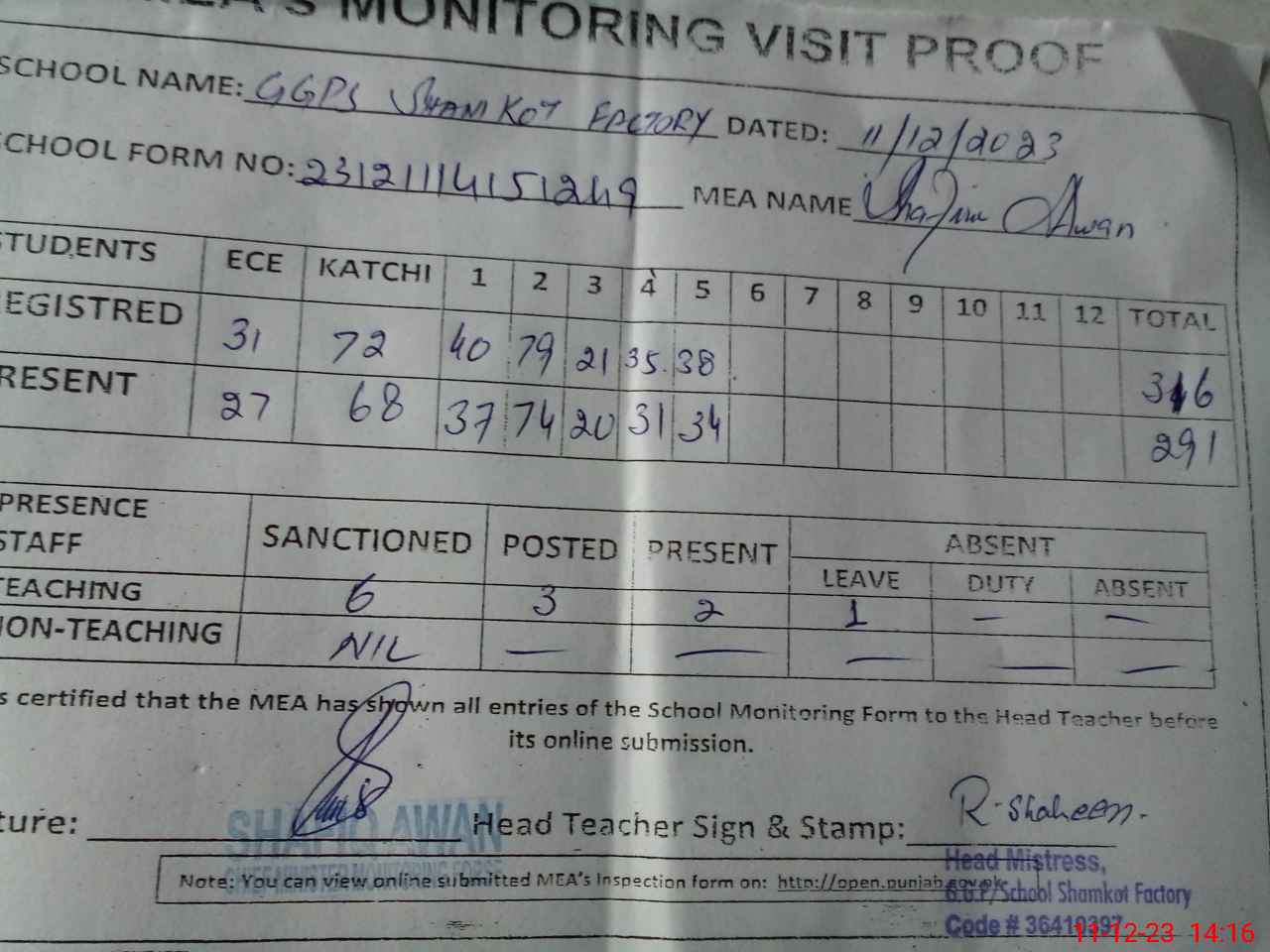| EMIS Code: 36410397 | Name of School: GGPS SHAM KOT FACTORY, KABIRWALA | |||