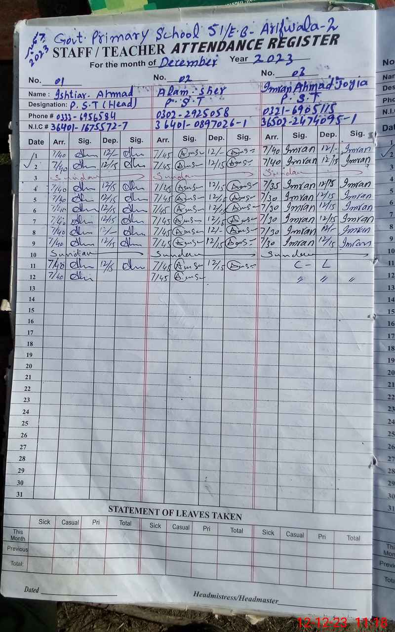 | Name: IS**** AH**** Designation: (School Headmaster's/Headmistress's) PST Phone/Cell Number: 03**** |