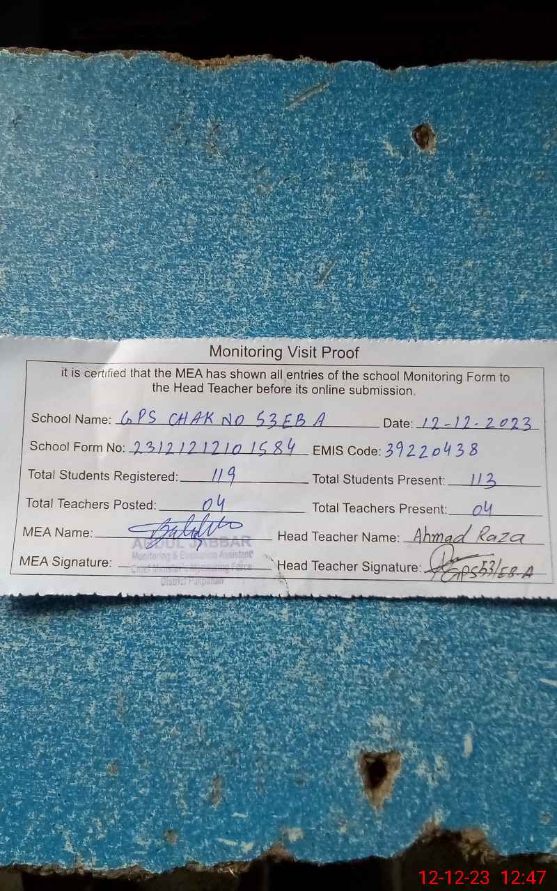 | EMIS Code: 39220438 | Name of School: GPS CHAK NO. 53 EB A | |||