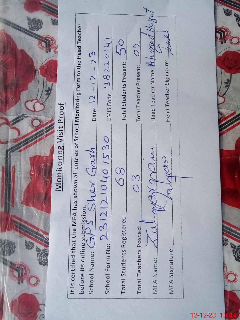| Attendance Register | Head Teacher | MEA with School | Visit Proof |