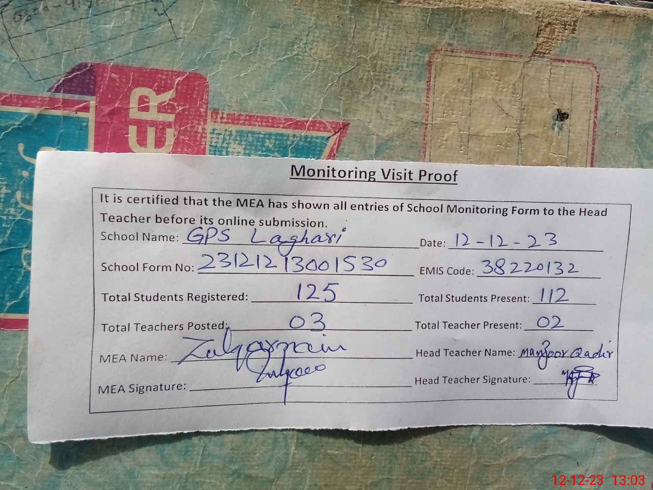 | Attendance Register | Head Teacher | MEA with School | Visit Proof |