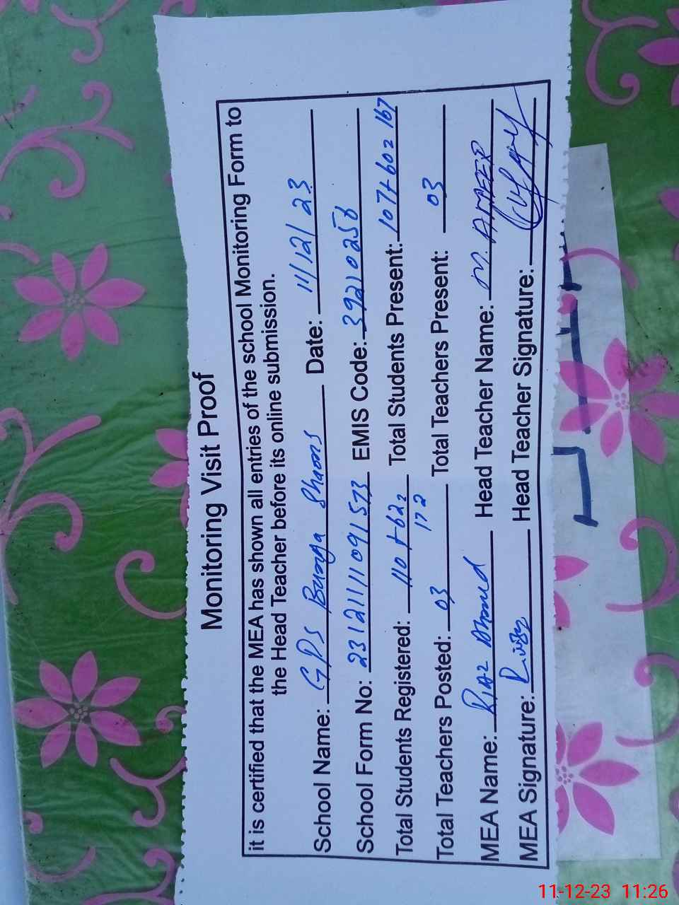 | Attendance Register | Head Teacher | MEA with School | Visit Proof |