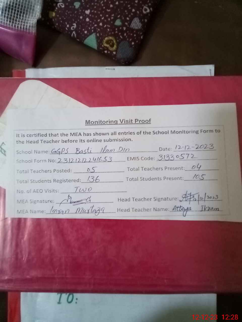 | Attendance Register | Head Teacher | MEA with School | Visit Proof |