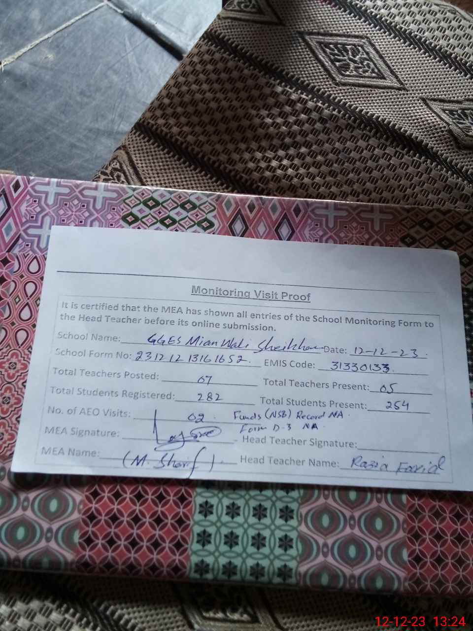| Monitoring Date: 12-12-2023 | Start Time: 12-12-2023 12:47 PM | End Time: 12-12-2023 01:26 PM | Name of MEA: Mu**** Sh**** | |