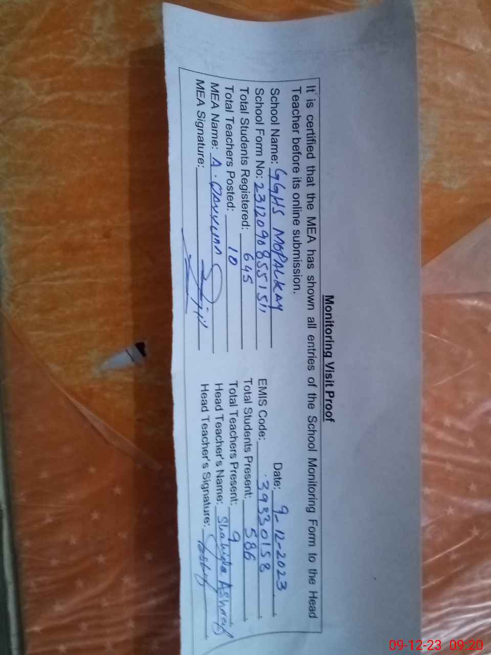 | Attendance Register | Head Teacher | MEA with School | Visit Proof |