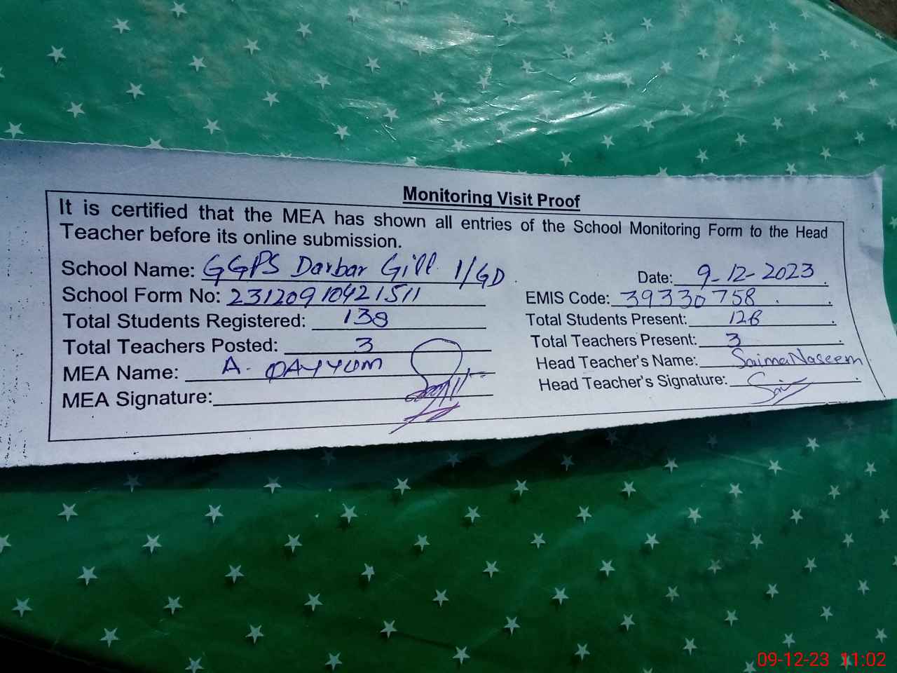 | Attendance Register | Head Teacher | MEA with School | Visit Proof |