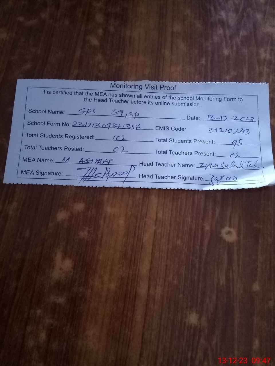 | EMIS Code: 39210243 | Name of School: GPS CHAK NO. 59 / SP | |||