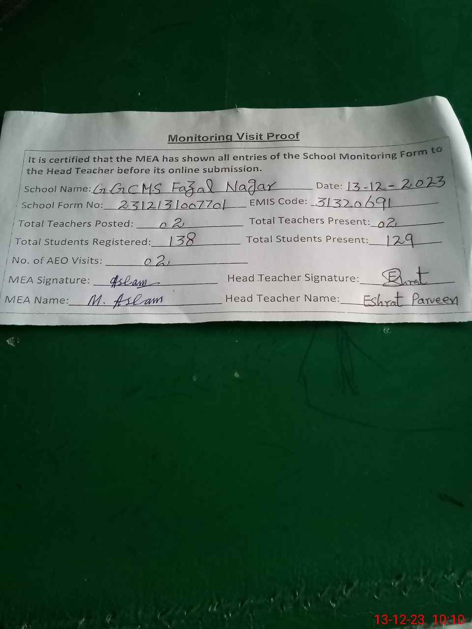 | Attendance Register | Head Teacher | MEA with School | Visit Proof |