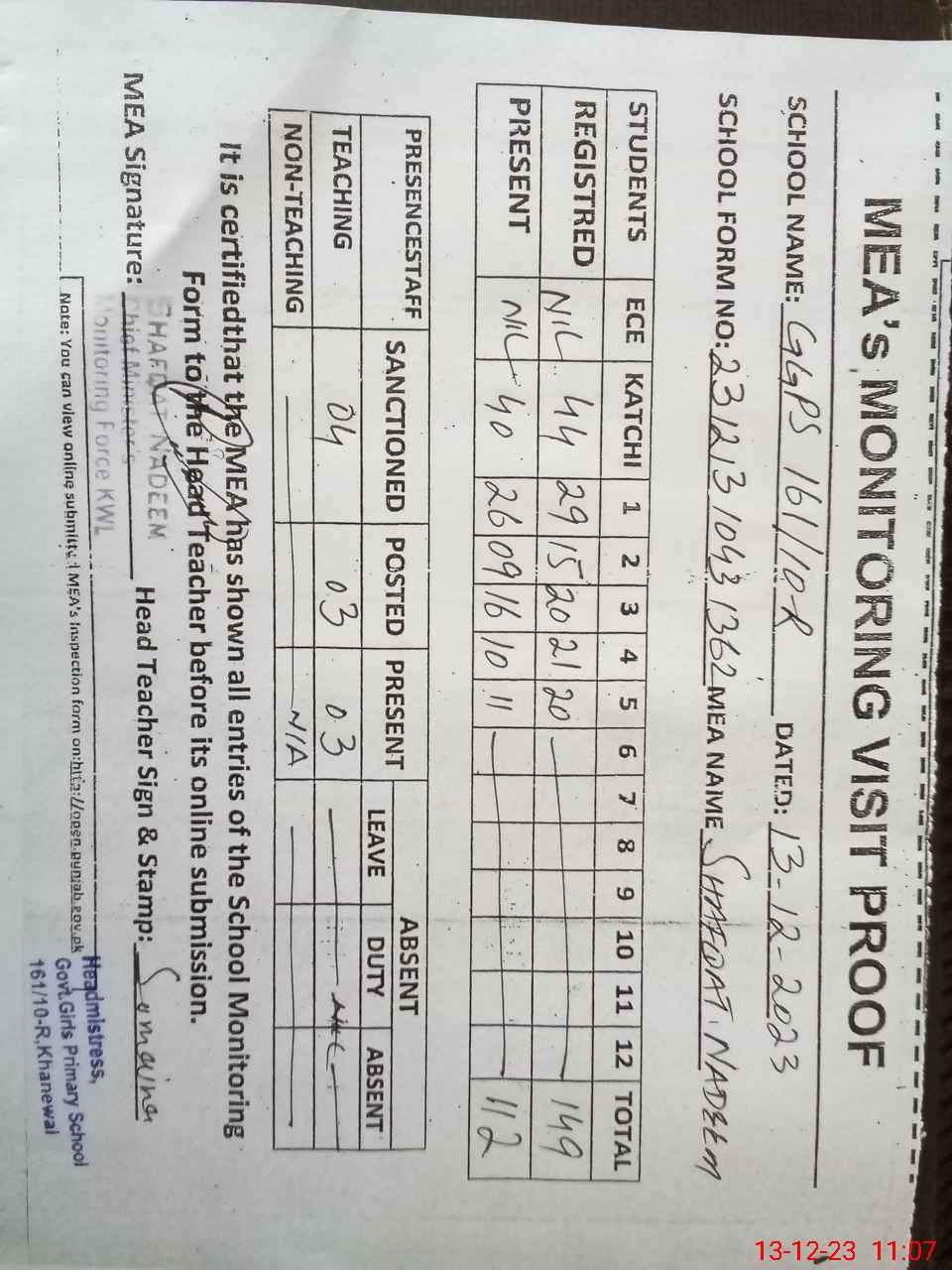| Attendance Register | Head Teacher | MEA with School | Visit Proof |
